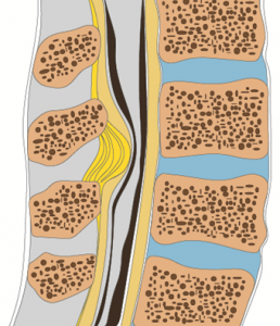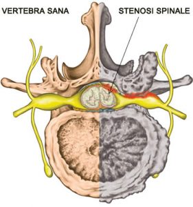 La stenosi vertebrale implica un restringimento del canale vertebrale con conseguente sovrapposizione delle vertebre e compressione dei nervi spinali e del midollo spinale.