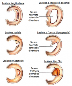 Il menisco può rompersi in diversi modi. Le lesioni sono conosciute e classificate in base al loro aspetto e alla zona in cui si verifica la lesione stessa. Le lesioni più comuni includono: